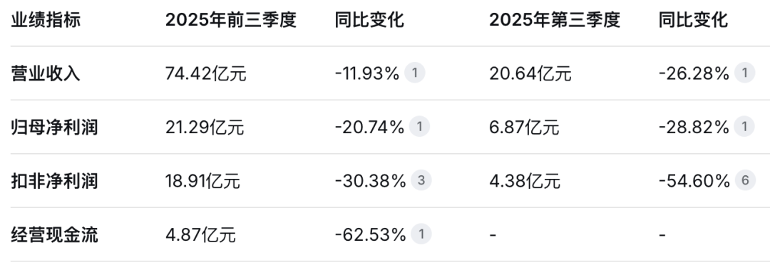 前三季度营收74亿元,同比下降11.9%;净利润21亿元,同比下降20.7%。单看三季度,营收20.6亿元,同比下降26.3%;净利润6.87亿元,同比下降28.8%;扣非净利润下降至54.6%。