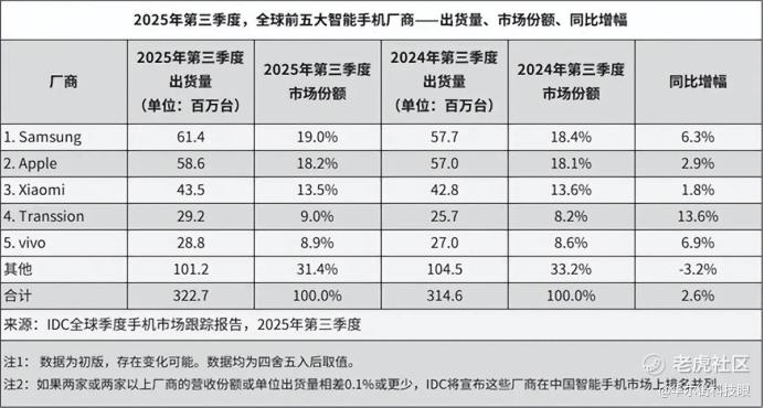 放眼于全球市场,荣耀的处境更加严峻。同样是来自IDC数据,2025年第三季度,三星、苹果、小米、传音和vivo稳居全球出货量前五,其他厂商共享约31.4%的市场份额。结合2024年数据,荣耀手机全球市场份额应该在4%-5%左右,与TOP5有较大差距。考虑到全球市场的复杂性和竞争强度,短时间内突围有难度。