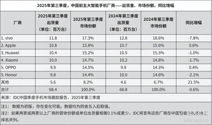 IDC数据显示,2025年第三季度,荣耀重回中国智能手机厂商出货量TOP5,市场份额为14.4%,与OPPO仅相差0.1个百分点。相对于前两个季度的榜上无名,上半年新机的销售的确起到了一定作用。不过同比去年,荣耀第三季度的出货量下降了2.1%,增幅逊色于苹果、小米、**等品牌。