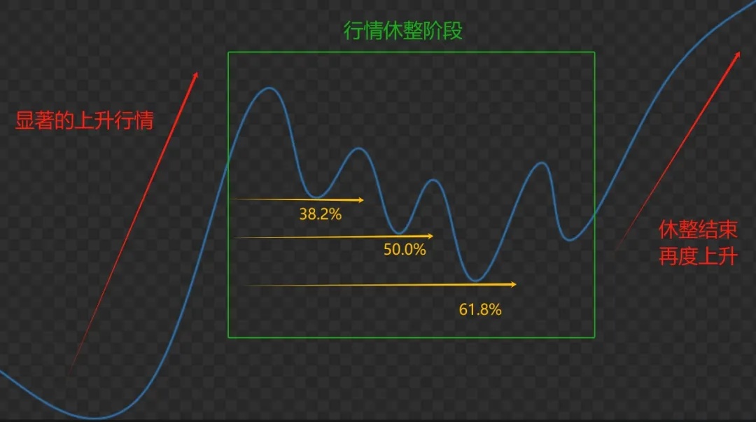 大家看这张图:一段显著的上升行情结束后,接下来的休整阶段,通常有三条重要的支撑位,分别位于38.2%、50%、61.8%的位置,当股价到达这些支撑位的时候,通常会有所反弹。