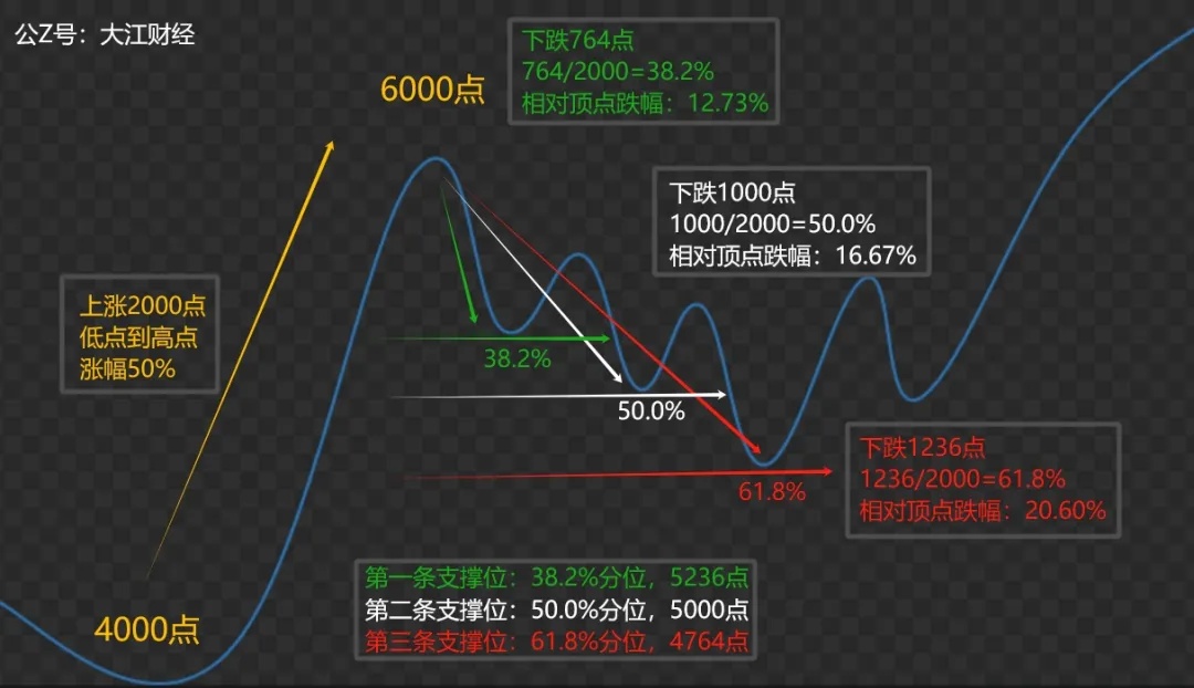 大家看一下这张图,某个指数,从4000点单边上涨到6000点(一段显著的上升趋势),后面进入休整阶段,第一个重要支撑位,38.2%分位,是指,从最高点6000点下跌了764点,764/2000=38.2%,很多人以为是从最高点6000点下跌38.2%,不是的,38.2%的支撑位,相当于从最高点6000点下跌了12.73%。以此类推,50%分位,就是指从最高点6000点跌了1000点,1000/2000=50%,50%支撑位,从最高点的下跌1000点,幅度为16.67%。61.8%的支撑位,从最高点6000点下跌1236点,幅度为20.60%。