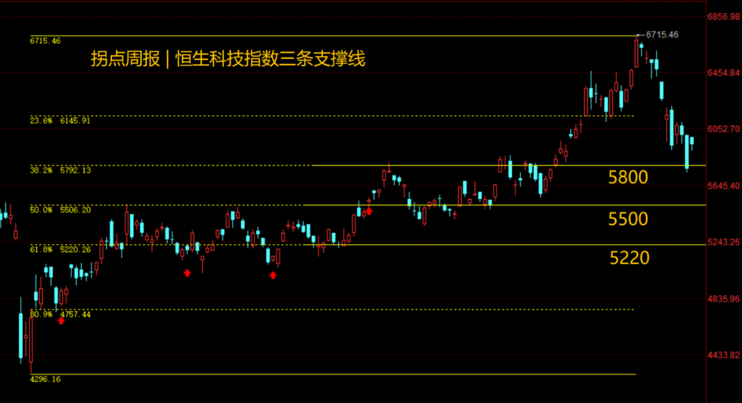38.2%分位:5800点附近;50%分位:5500点附近;61.8%分位:5220点附近。以上理论告诉我们,若恒生科技跌到5800点附近,可以补一点仓;若跌倒5500点附近可以补更多;若跌到5220点,先别急补,观察一下会不会跌破,若有效跌破,则大周期破坏了,不能补了,要逃了。若没有效跌破,在5220点放量反弹了,则在此加码补仓。再度强调,以上三个支撑位不是预测值,是应对方案。当然,投资不是简单的算术题,历史经验并不代表未来,我们要敬畏市场,根据市场的变化,作出合理的决策,不要盲从理论。