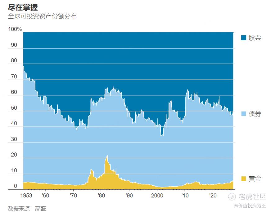 根据高盛(Goldman Sachs)策略师的一项研究,黄金在全球投资资产中所占比例在两年内已从4%跃升至6%,为1986年以来的最高水平。而在1980年那场通胀失控叠加泡沫的极端情况下,黄金占全球投资资产的比重曾高达22%。 $紫金黄金国际(02259)$ $老铺黄金(06181)$