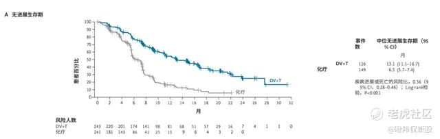 在PFS层面,维迪西妥单抗+特瑞普利单抗治疗组画出了一条非常漂亮的曲线,mPFS达到13.1个月,显著优于对照组的6.5个月,mPFS相比含化疗实现了翻倍,0.36的HR也展出这一项数据的统计学显著性;