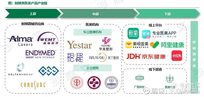 对于射频类医美产品领域而言,其完整的产业链条是由三大核心环节紧密相扣而成,上游供应商、中游医美机构和下游的医美获客平台以及终端消费者。