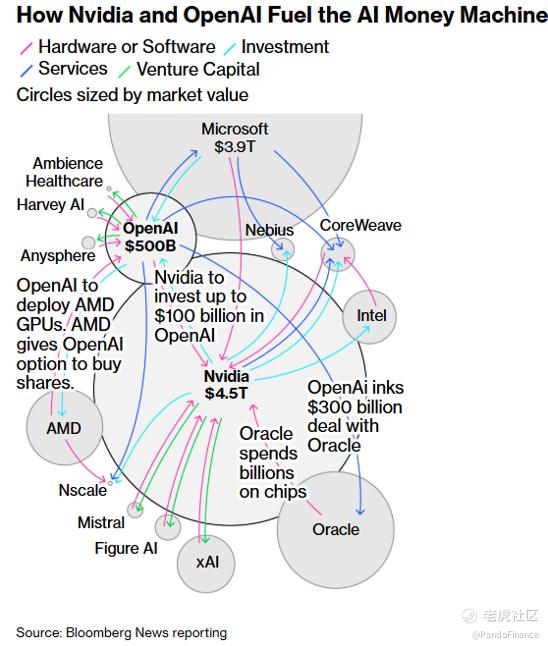 随着近期AI供应链融资活动越发频繁,对AI是否泡沫化的讨论更加火热。截至九月底,Magnificent 7 的总市值超过20万亿美金,约为全球GDP的1/5,超越除美国歪任一国家的GDP。OpenAI的估值超过了5,000亿美金,它在接受英伟达投资的同时,又和Oracle合作建设数据中心,将订单给回了英伟达以及AMD、博通等个股,带动了相关上市公司股价的强势表现。这些企业“真金白银” 的支持使得AI基建的确定性不容置疑。然而,这些类似于供应链融资的手段,也确实存在资金内循环和自我强化的系统性风险,资金仅在少数玩家间流动,推高企业估值却不一定直接创造了更广泛的经济价值。