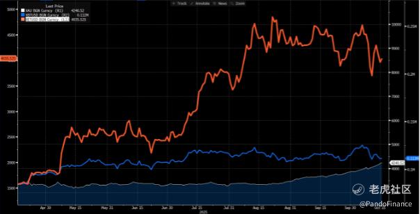 面对宏观经济以及财政纪律的不确定性,投资者转向黄金和数字货币配置。黄金突破 4,300 千美元/盎司大关,比特币、以太坊价格也在十月初达到近期新高。