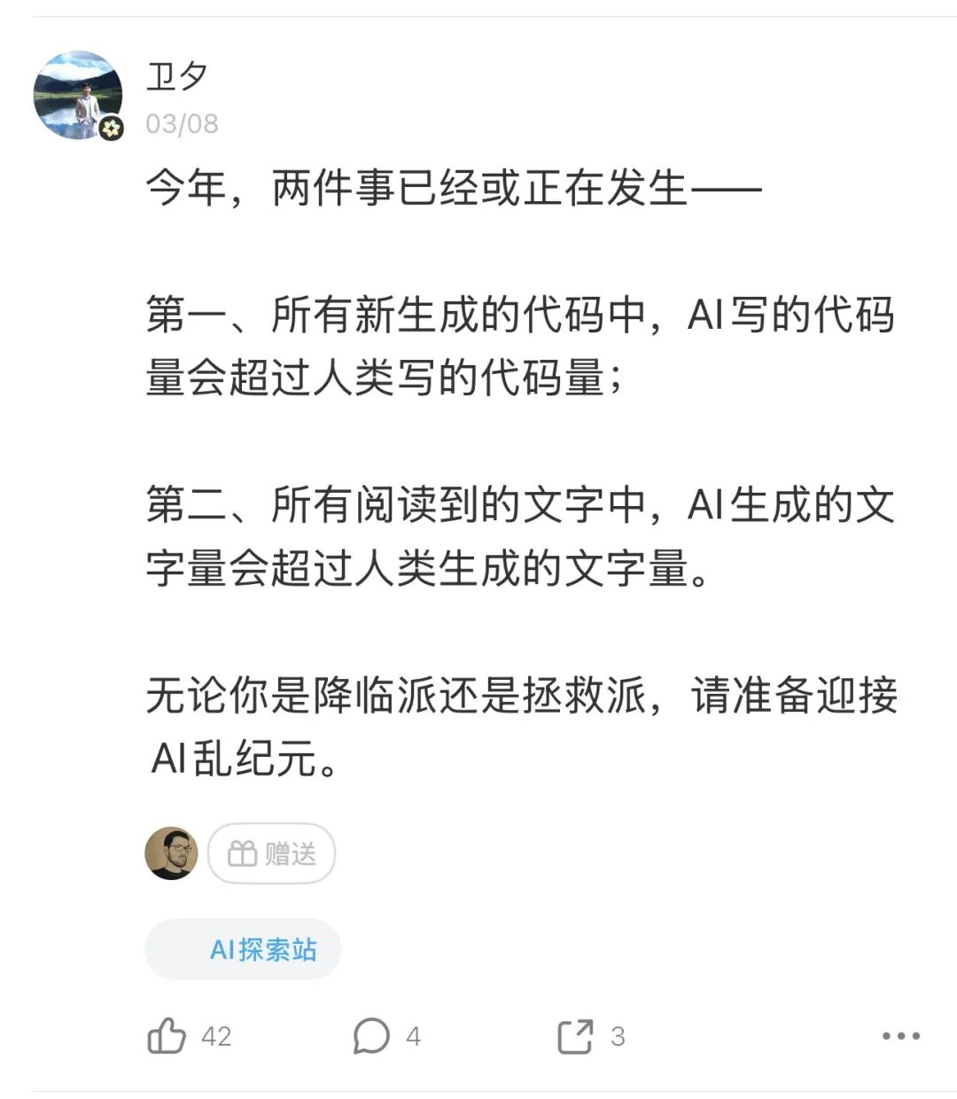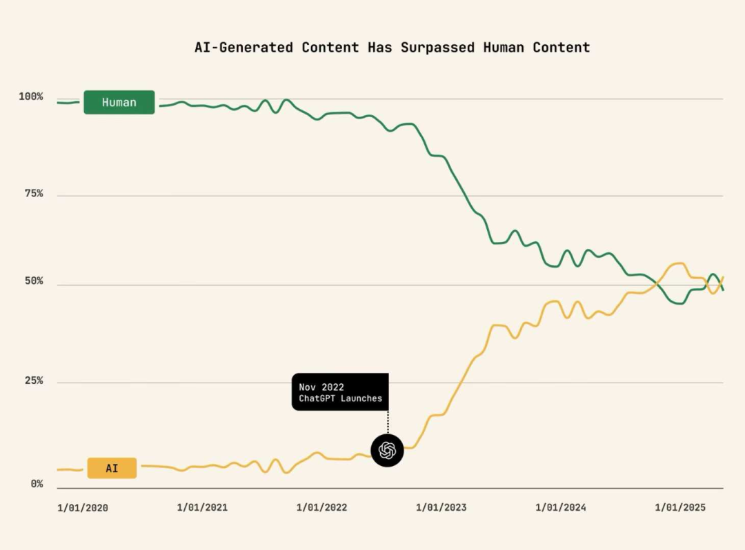 其实早在去年11月份,互联网上由AI生成的文字已经达到50%了。