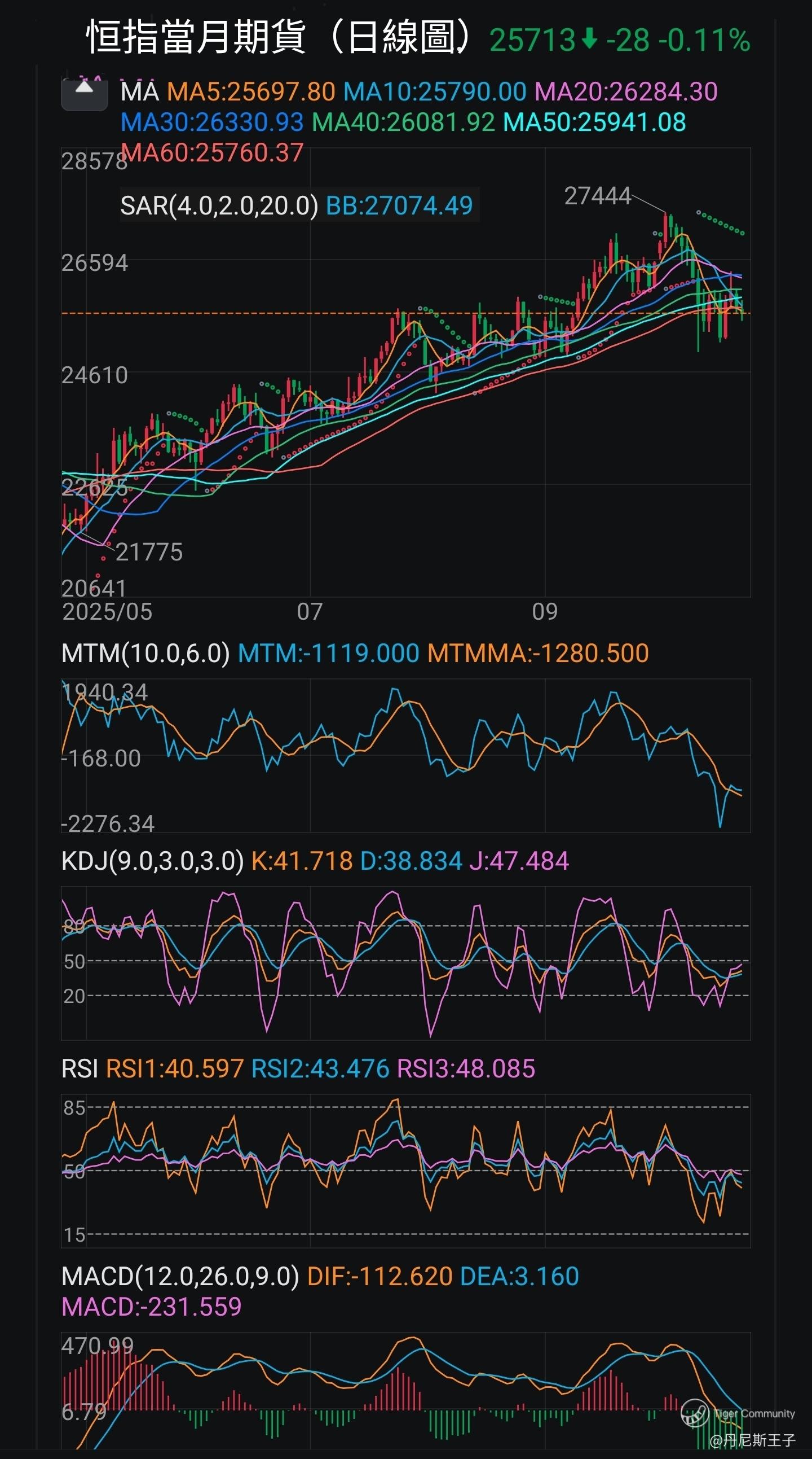 恒生指数位于(5,60)天移动平均日线之上,(10,20,30,40,50)天移动平均日线之下,(5,10,20)天移动平均日线趋势向下