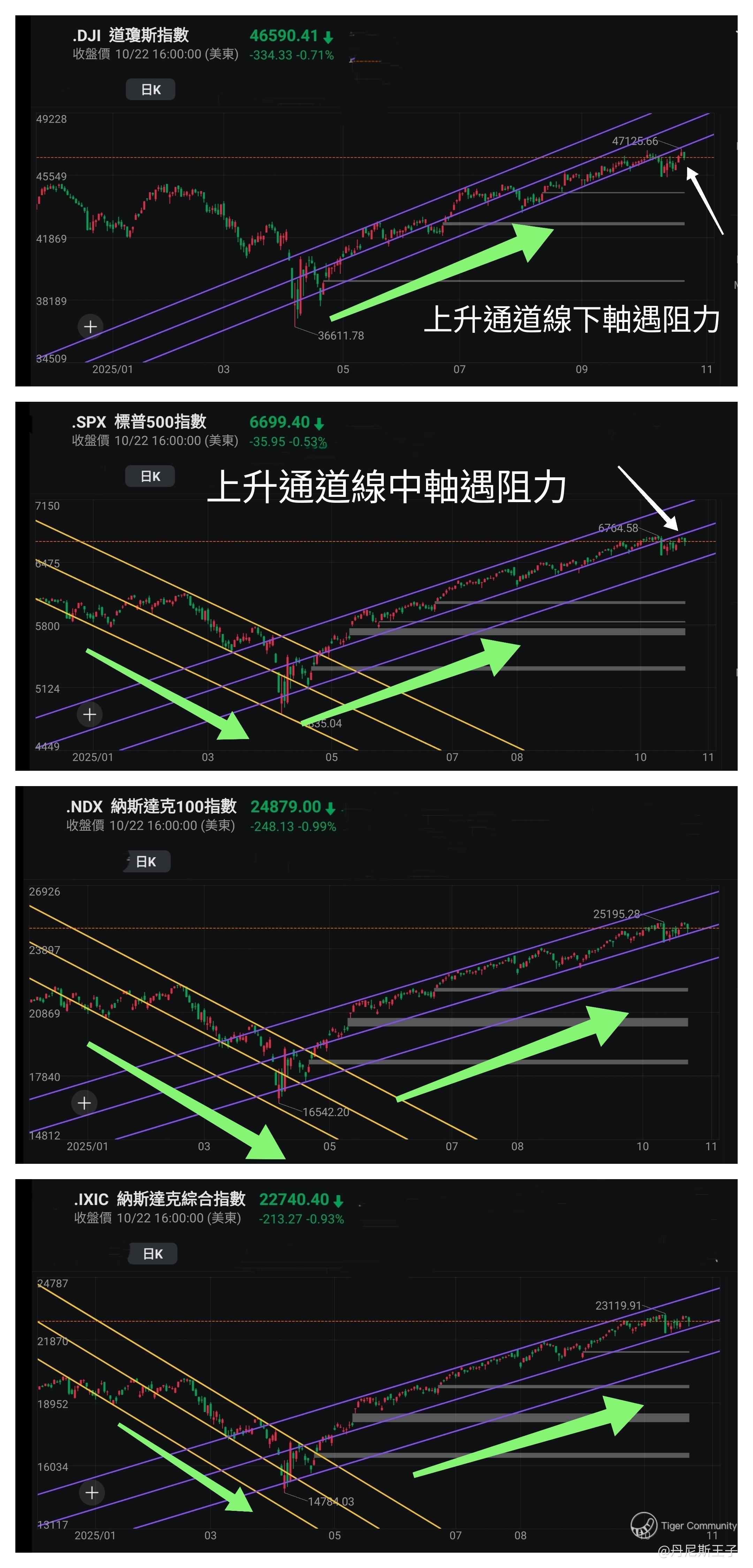 10月22美股市四个指数( 道琼斯指数 (.DJI.US) 、 标普500指数 (.SPX.US) 、 纳斯达克100指数 (.NDX.US)、 纳斯达克综合指数 (.IXIC.US)$)收跌。