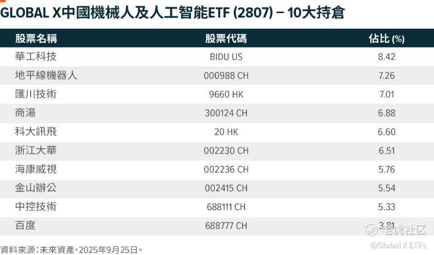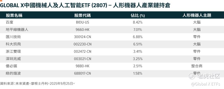 Global X 中国机械人及人工智能 ETF(2807 HK)投资于中国领先的机器人和人工智能公司。该 ETF 有 40% 的成分股在人形机器人供应链中,跨越大脑(百度、科大讯飞)、机器人零部件(汇川技术、双环、兆威)和整合商(优必选)。