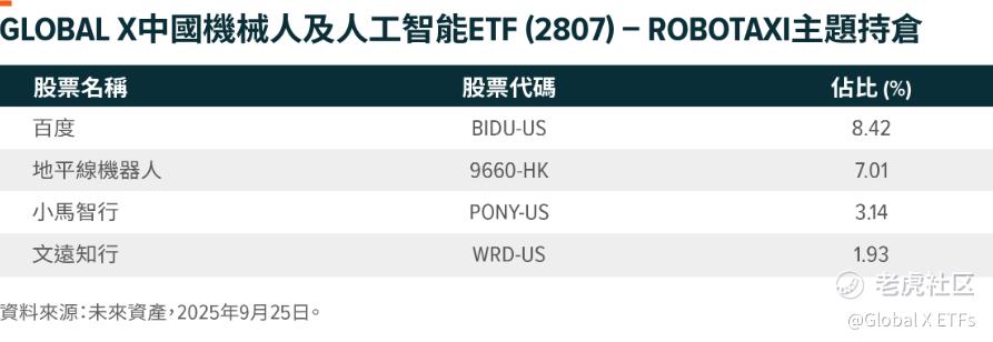 Global X 中国机械人及人工智能 ETF(2807 HK)也通过投资于百度、地平线机器人、Pony AI 和 Weride 等企业,受益于 Robotaxi 的发展。