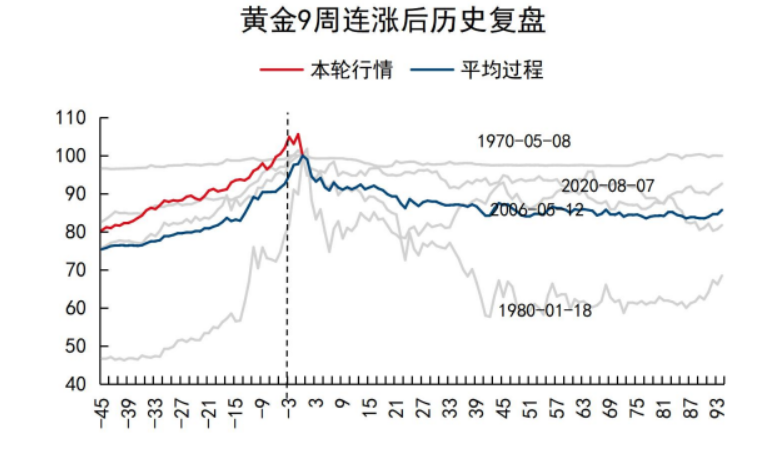 黄金后市怎么看?历史上来看,黄金在连涨9周后调整压力确实很大。据国信证券数据,除1970年外,9周连涨后最大跌幅介于17%-42%之间;从持续时间看,最大跌幅大致发生在转折点后23至148个交易日。这意味着投资者需要为可能持续数月、幅度达20%-40%的调整做好心理准备和仓位管理。
