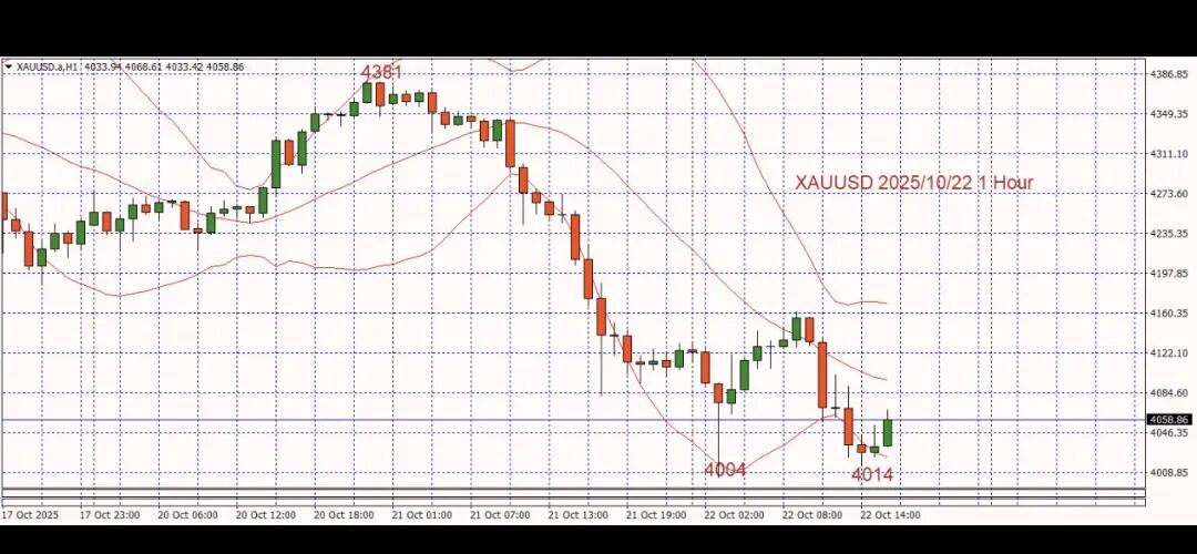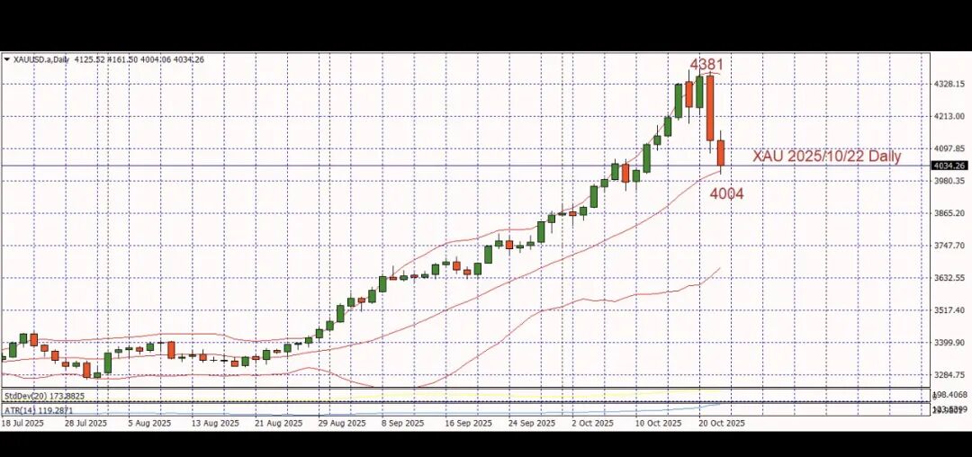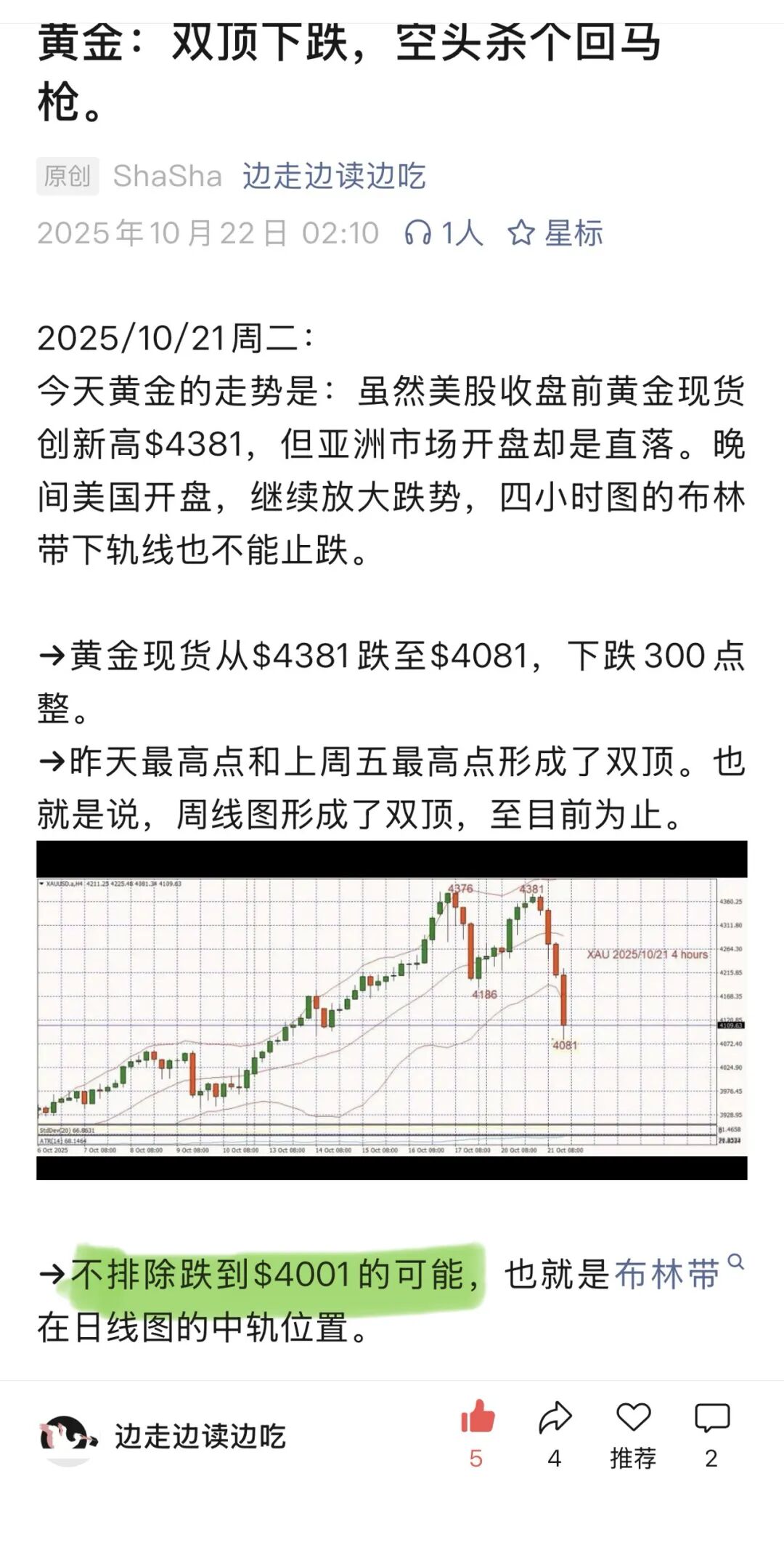 昨天我们说现货黄金可能跌到$4001。今天黄金上午跌到$4004反弹,晚间又跌到$4014,形成了双底。