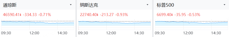 美东时间周三,美股三大指数集体收跌。截至收盘,道琼斯指数跌0.71%,报46,590.41点;标普500指数跌0.53%,报6,699.40点;纳斯达克指数跌0.93%,报22,740.40点。