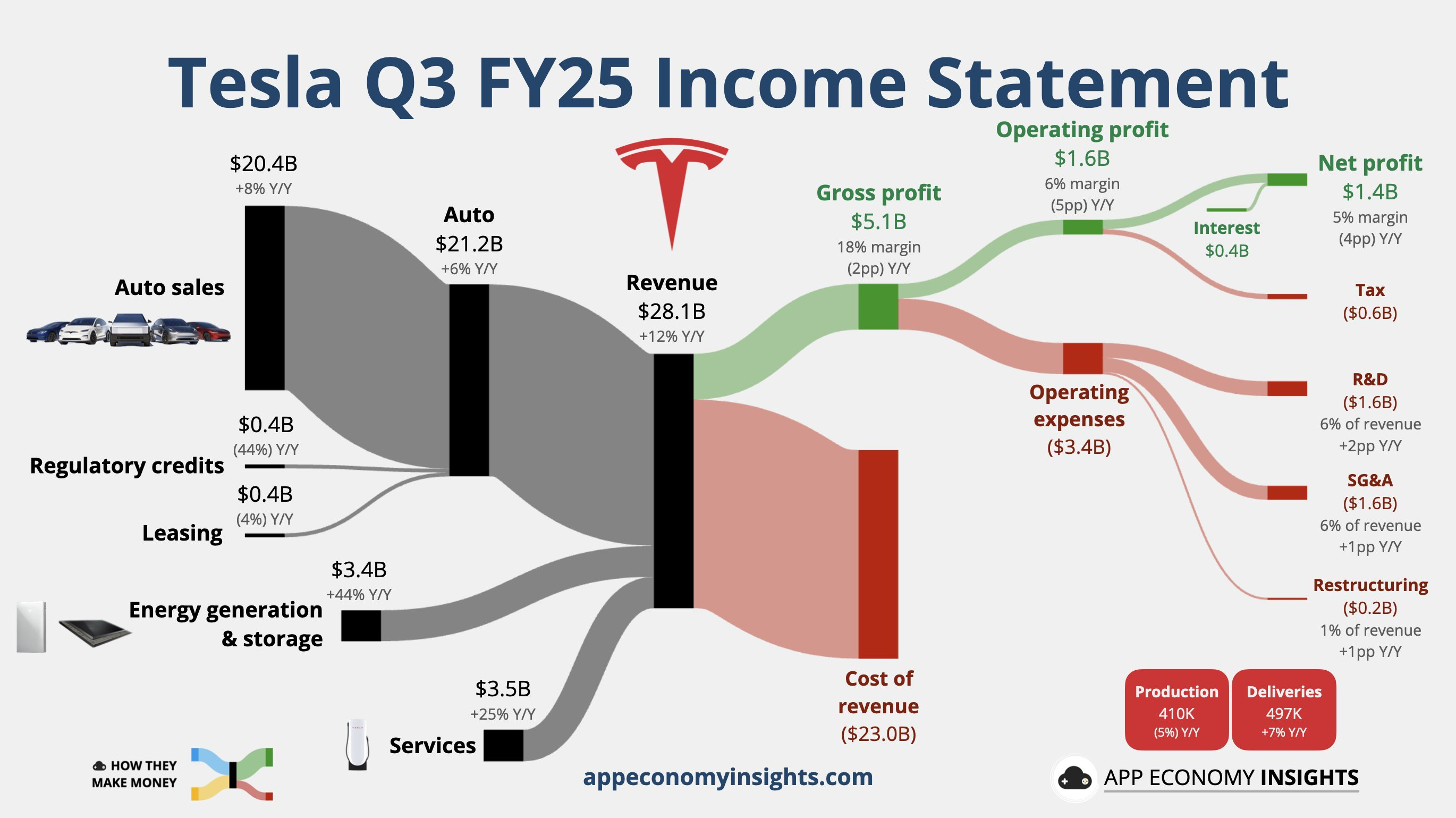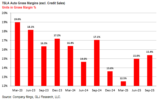 Q3财报“in-line”(符合预期),数字够稳,不会动摇市场共识,但质量高。总营收281亿美元,同比大增11.6%(电话会议提到环比涨29%),超过市场共识的7.17%。汽车业务占比降到75%,能源和服务业务成了新增长引擎,同比涨44%,服务业务涨25%,毛利率分别高达20.9%和整体18%。剔除监管信用的汽车毛利率15.4%,小幅回升,显示成本控制得当。