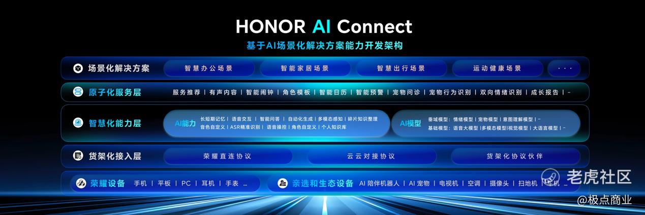 为解决用户面对“场景割裂、服务单一”的智能生态时带来的碎片化体验,并攻克行业长期存在的互联互通难题,荣耀基于HONOR AI Connect平台,发布了8大AI场景化生态解决方案,覆盖智慧家居、智慧车联、潮玩陪伴、宠物健康、运动健康、教育学习、智慧音频、商务办公等场景。此次发布的8大AI场景化生态解决方案深度融合软硬件能力,是荣耀构建AI生态的核心引擎。荣耀将把这些解决方案全面向行业开放,携手合作伙伴共同推进更多AI垂直领域的生态共创,打造一个繁荣、开放、持续进化的AI终端生态,全面构建以人为中心的智能生活闭环。