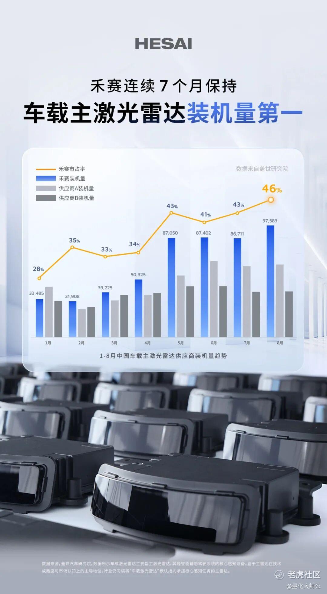 本周,盖世汽车研究院发布了 2025 年 1-8 月车载激光雷达装机量排行榜。榜单显示,8 月份禾赛车载主激光雷达装机量继续稳居行业第一。禾赛已连续 7 个月主激光雷达市占率第一并保持高速增长,市场占有率已上升到 46%,约为第二名的 1.5 倍,第三名的 2.4 倍。