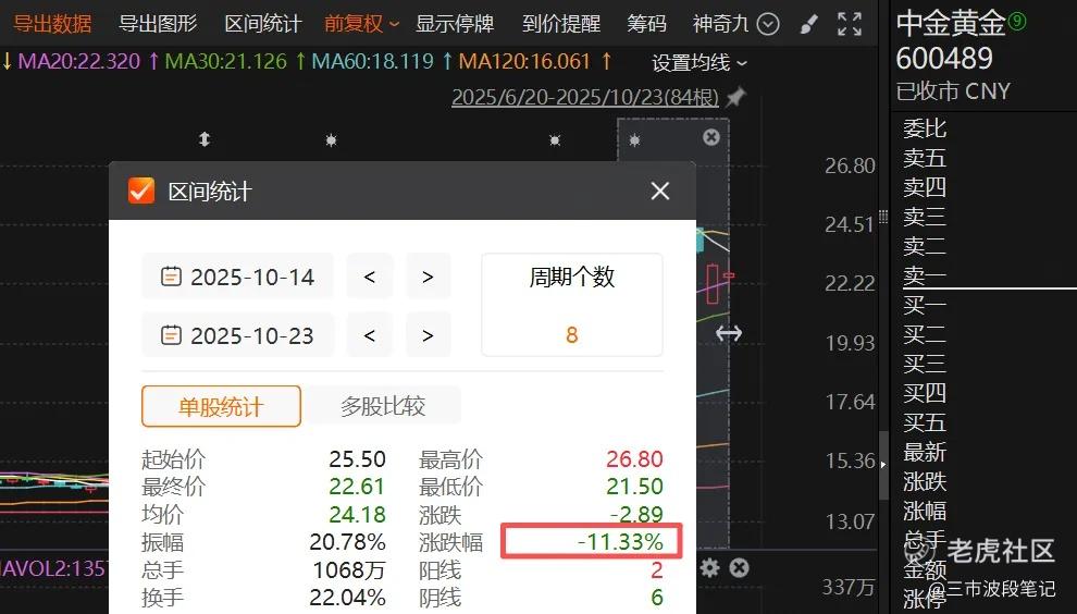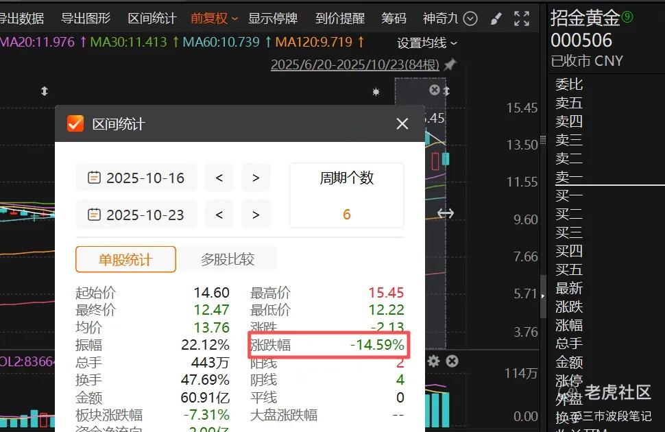 但是对应的黄金股以及对应的黄金杠杆ETF,跌幅是比较大的。盘子大一点的中金跌了11%,盘子小点的招金跌了14%左右。