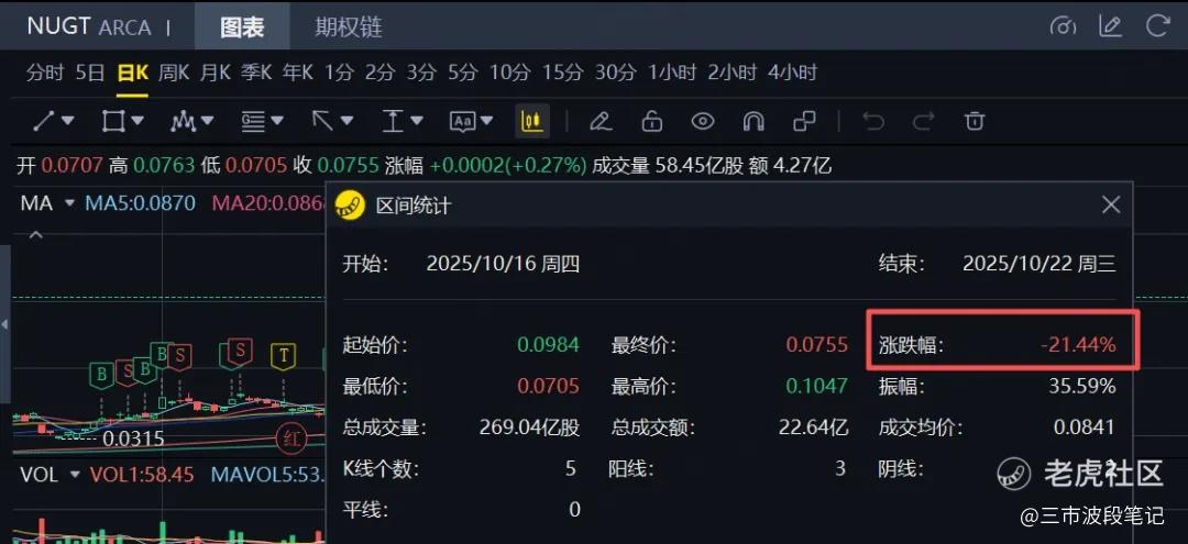 美股黄金的杠杆ETF,比如两倍黄金矿业跌了21%。