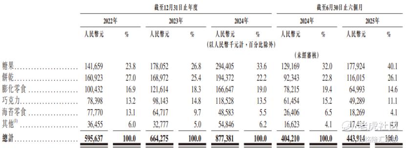 具体来看,2022年至2025年上半年(简称“报告期”),公司来自糖果的收入占比从23.8%提升至40.1%,饼干的收入占比超过20%,膨化零食、巧克力的收入占比均超过10%。