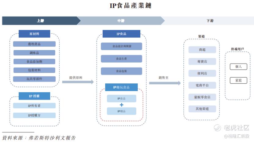 下游通过商场超市、专卖店、电商、杂货店和其他渠道,将产品送达消费者,实现IP食品的市场价值。
