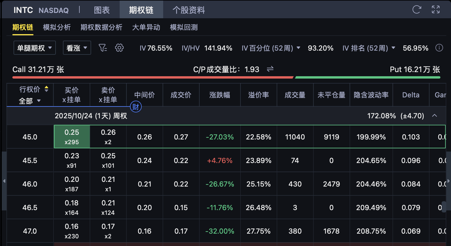 英特尔当前的隐含变动为±9.6%,表示期权市场押注其绩后单日涨跌幅达9.6%;对比来看,前四季度其绩后股价变动约为6.5%。