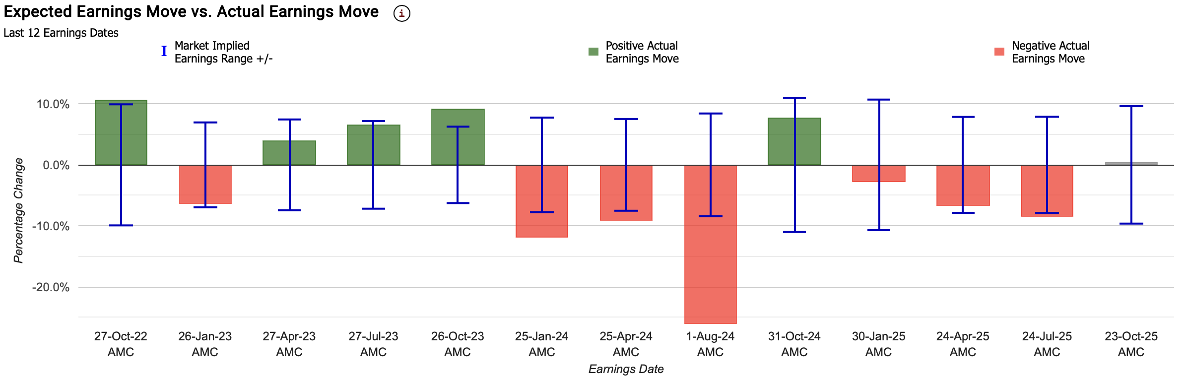 在过去 12 个季度中,期权市场高估了 INTC 股票的收益有 50% 的时间变动。 收益公布后的预测变动平均为 ±8.2%,而实际收益变动的平均值为 9.2%(绝对值)。 这表明 INTC 的波动性往往比期权市场对盈利股价反应的预测更大。