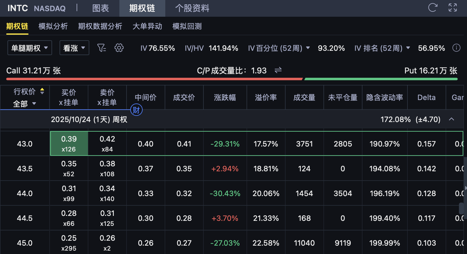 英特尔当前股价(S₀)= $36.92,卖出行权价 K₁ = $43 的看涨期权(Short Call),收入权利金 $0.41/股。