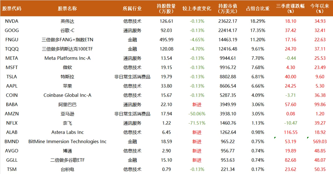 前七大重仓股占比超过 70%,其中英伟达和谷歌两家公司合计占比超过 35%,反映出他对AI算力与应用层逻辑的长期信仰。