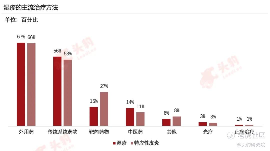 在湿疹的治疗方案中,外用制剂的使用最为普遍,占比高达67%。这得益于外用制剂能直接作用于皮肤病变部位,快速缓解炎症、瘙痒及渗出等状况,同时减少了全身性药物的潜在风险。其他补充方案则包括传统系统药物、靶向药物和中医药。