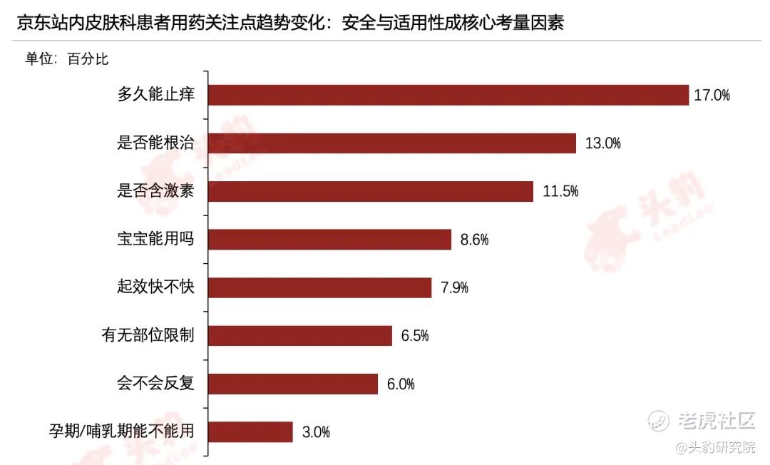 京东站内的皮肤科患者在选择药品时,展现出显著的认知升级和决策成熟化。他们的关注点已从“快速止痒”等即时疗效,转向对药品安全性的深度探究,如是否含激素、婴幼儿或孕期适用性等。此外,患者对“复发风险”和“根治可能”的关注,表明其诉求已超越短期症状控制,延伸至长期健康。这种从单一疗效到“安全性-疗效-适用性”三维综合评估的转变,反映了消费者心智的成熟,他们愿意为更安全、更精准的治疗方案支付价值。