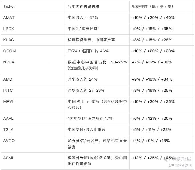 方向我觉得需要关注和谈利好的方向,我整理了一些数据,是关于美股科技股中在中国占比较高的一些公司,按照和谈利好假设了三种基准收益率(低中高),这个池子大家可以参考: