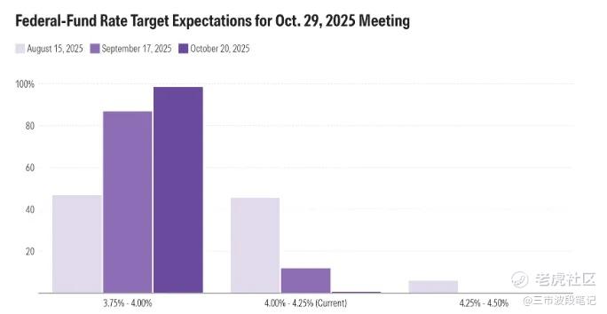 目前市场对于今晚美联储降息的预期依旧是2次,10月会议上降息25个基点的概率为98.9%,在12月会议上再次降息0.25个基点的概率为96.1%。