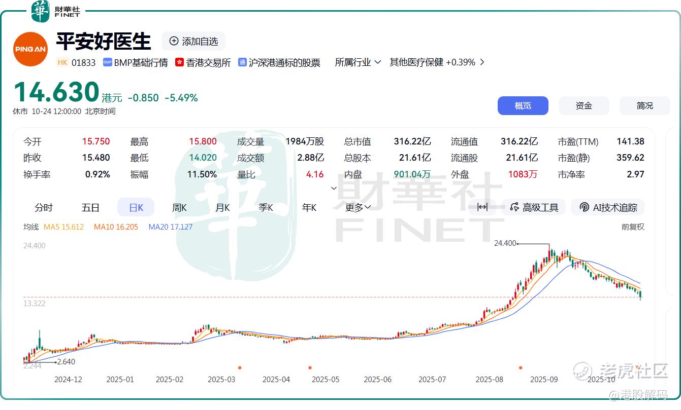 值得玩味的是资本市场的反映。10月24日,平安好医生(01833.HK)股价继续下行,一度下探9.4%,截至发稿前,该股跌幅为5.49%,报14.63港元/股。