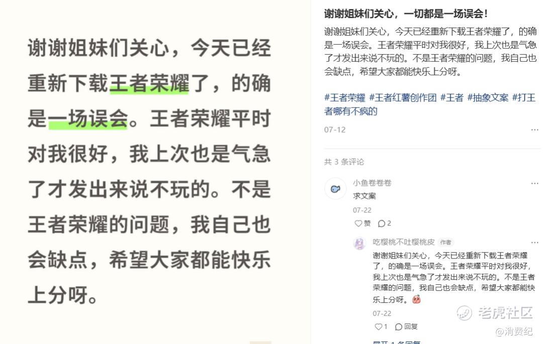 “谢谢大家关心,今天已经重新下载王者荣耀了,的确是一场误会。王者荣耀平时对我很好,我上次也是气急了才发出来说不玩的。不是王者荣耀的问题,我自己也会缺点,希望大家都能快乐上分呀。”