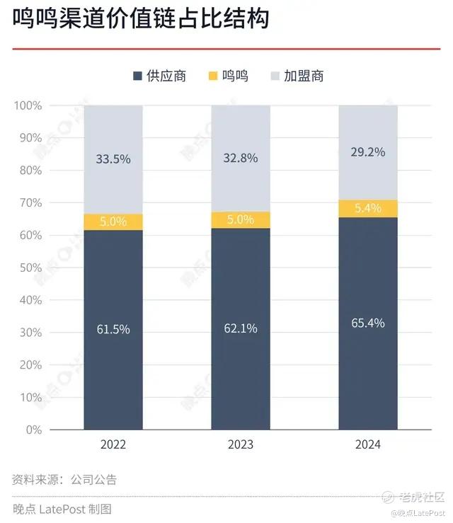 - 2024 年,在 “供应商-量贩品牌商-加盟商” 的商品流通价值链上,鸣鸣价值链的分配比例为 65.4%-5.4%-29.2%,万辰价值链则为 66.5%-8.1%-25.4%。