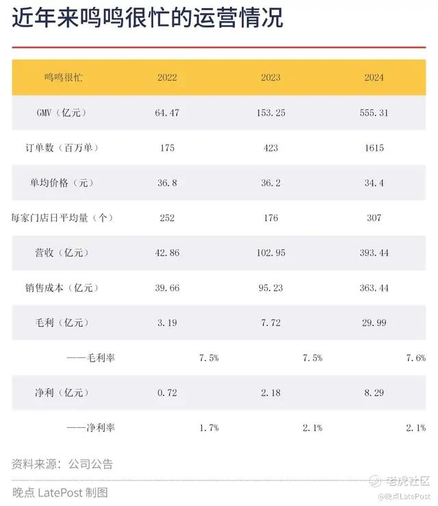 - 2024 年,在 GMV、营收、订单量、以及门店数上,鸣鸣分别为 555 亿元、393 亿元、16 亿笔、以及 1.44 万家,万辰则分别为 426 亿元、318 亿元、12 亿单、以及 1.42 万家;