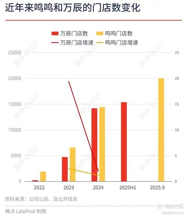 截止 2025H1,万辰门店数只增长至 15365 家,而截止今年 9 月初,鸣鸣的门店数已经突破 2 万家,显然,相比鸣鸣加盟店持续的高增长态势,万辰已开始显现其门店增长的边际。
