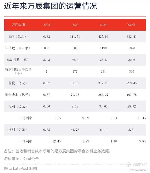 但,高周转的商流生意均会呈现动态变化的属性,这源于行业间竞争、自身商业效益、上下游间利益博弈等诸多因素,这种动态属性在万辰更加明显。2025H1 万辰上述数据发生了很大变化,背后的原因或许在于万辰的扩张速度——两年多时间便实现了头部规模。