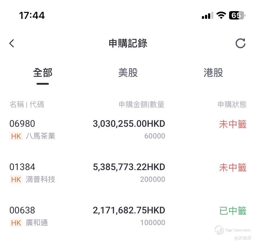 $八马茶业(06980)$ 和$滴普科技(01384)$ 都抽唔中,抽中的$广和通(00638)$ 又潜水惨蚀,唔通连天都唔钟意我[流泪] 话明天一定会好天的肥仔同我行出来,我相信下个礼拜新股一定大爆上去[喷血]