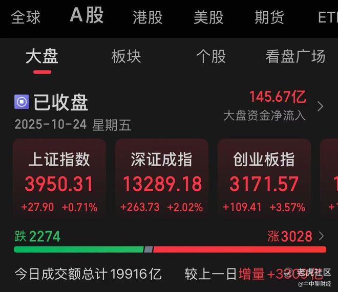 $上证指数(000001.SH)$ 10月24日,A股三大指数集体走强,市场情绪显著回暖。截至收盘,上证指数上涨0.71%,报3950.31点,续创十年新高;深证成指涨2.02%,创业板指大涨3.57%,北证50亦上涨1.15%。沪深京三市全天成交额达19916亿元,较前一交易日放量超3300亿元,市场交投活跃,资金做多意愿明显增强。