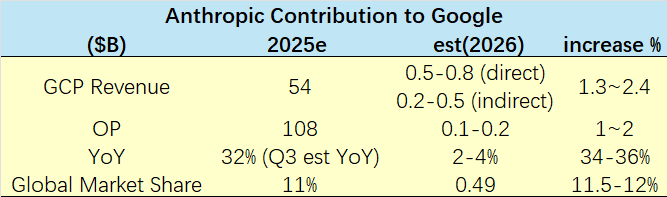 Anthropic对Google的收入贡献估算:相当于Google Cloud 2025年全年收入的2-4%增量,推动年增长率从32%升至34-36%。