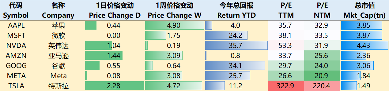 大科技本周也表现都相对较好,至10月23日收盘,过去一周 $苹果(AAPL)$ +4.9%, $微软(MSFT)$ +1.75%, $英伟达(NVDA)$ +0.19%, $亚马逊(AMZN)$ +3.09%, $谷歌(GOOG)$ $谷歌A(GOOGL)$ +0.64%, $Meta Platforms, Inc.(META)$ +3.08%, $特斯拉(TSLA)$ +4.72%。