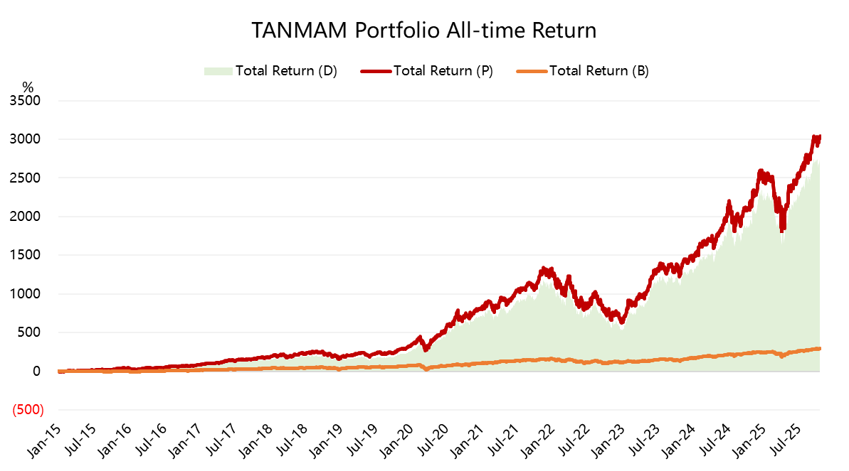 七巨头(Magnificent Seven)组成一个投资组合(“TANMAMG”组合),等权重、每季度重新调整权重。回测结果从2015年以来表现是远超标普500的,总回报达到了3040.33%,同期SPY回报292.96%,超额收益2747.37%,仍然在高位。
