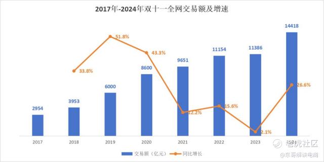 双十一一年比一年卷,消费者对大促已经祛魅了。对应的是全网交易额增长速度不断下滑,只能通过延长时间的方式维持数据增长。