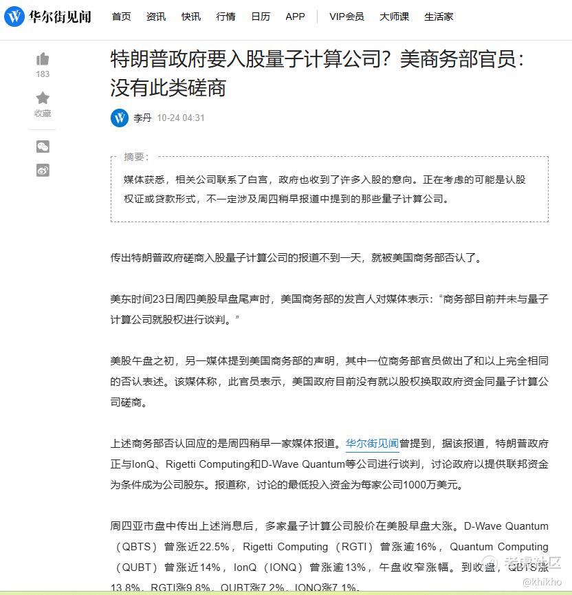 1. 政府潜在投资,据《华尔街日报》和CNBC报道,美国政府正考虑对量子计算公司进行股权投资,包括DWave、IonQ和Rigetti,最低资助金额为每家公司1000万美元。