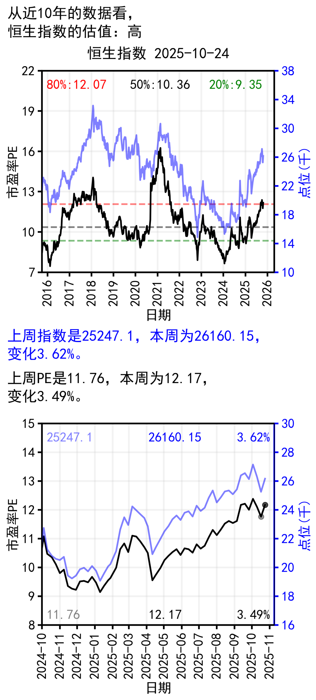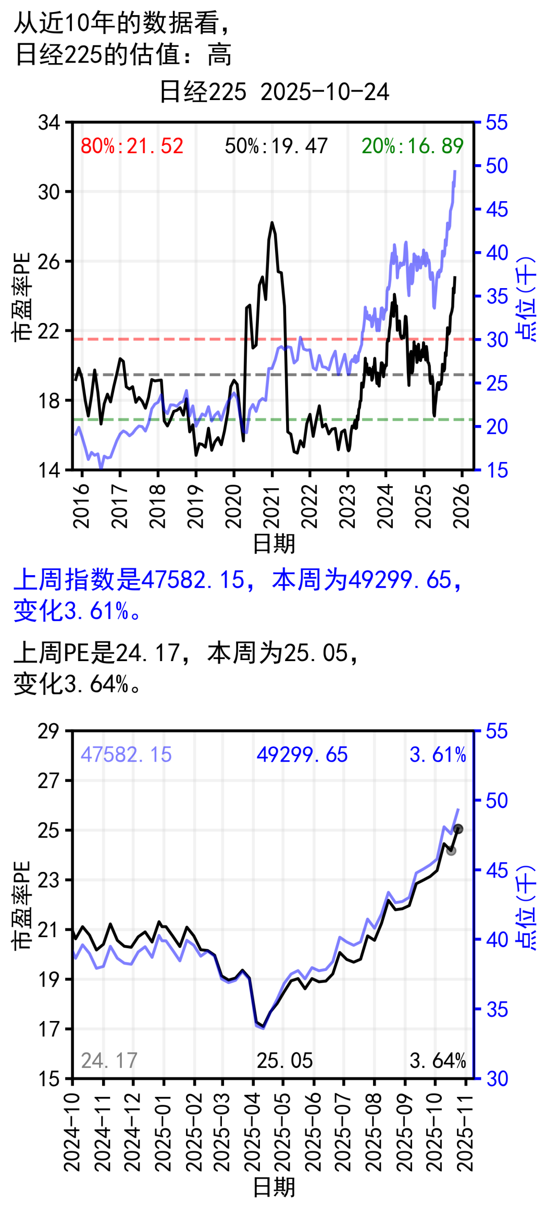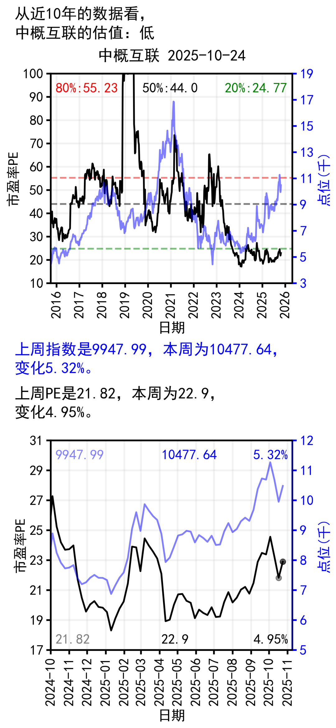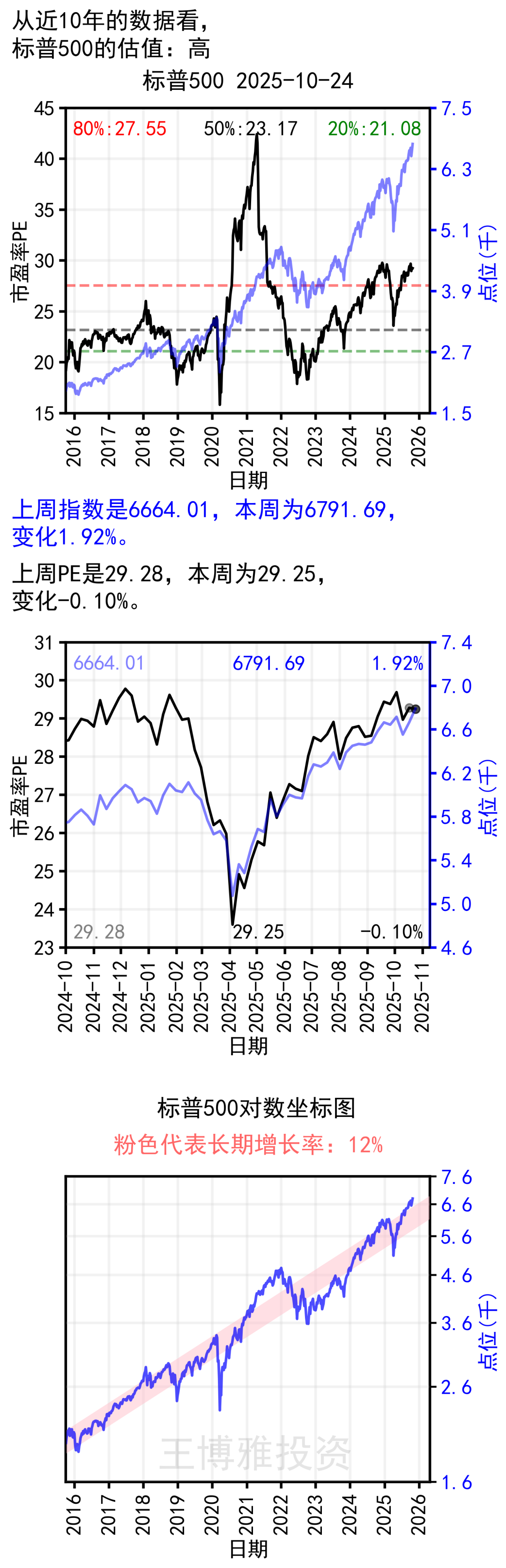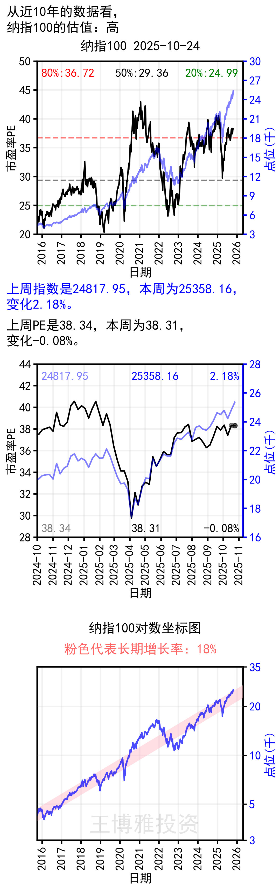 本周纳指100大涨,市盈率相比上周基本持平,整体估值微高。
