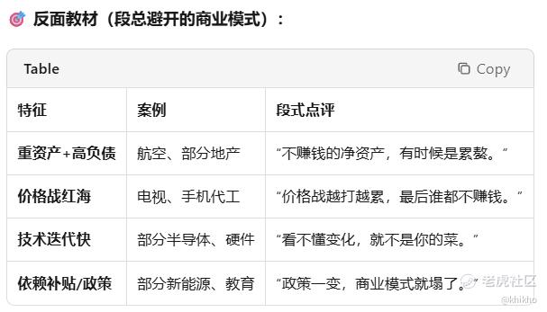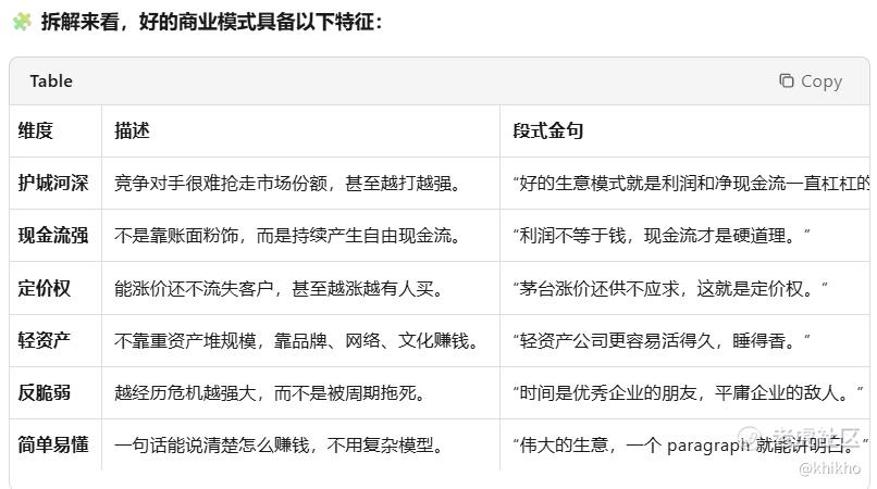 为了验证一下我的理解,我把段永平投资问答录给Copilot总结提炼,看看一下这个AI用2分钟时间提炼出来的内容,给出的答案是 - 关键标准是利润和净现金流长期强劲,不仅要赚钱,还要能持续产生充足的净现金流。竞争对手长期难以抢夺,模式必须具备强大的护城河,竞争者在很长时间内无法轻易复制或替代。护城河坚固且可持续,包括产品差异化、品牌力、企业文化等。毛利率合理且稳定,产品不可轻易被替代,长期保持较高毛利。企业文化与能力匹配,没有企业文化和能力,很难建立好的商业模式。