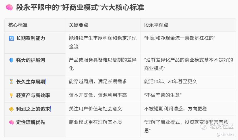 怎么感觉这个段永平眼中的“好商业模式”六大核心标准,更加详细一些。我的理解,既然没有一个AI那么透彻。也是醉了 [捂脸]